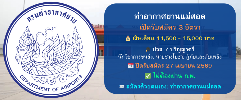 - ท่าอากาศยานแม่สอด เปิดรับสมัครลูกจ้างทุนหมุนเวียน 3 อัตราท่าอากาศยานแม่สอด เปิดรับสมัครลูกจ้างทุนหมุนเวียน 3 อัตรา (ปวส. / ปริญญาตรี) สมัครด้วยตนเอง 9 – 27 เมษายน 2569ท่าอากาศยานแม่สอด เปิดรับสมัครลูกจ้างทุนหมุนเวียน 3 อัตรา