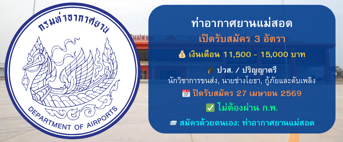 ท่าอากาศยานแม่สอด เปิดรับสมัครลูกจ้างทุนหมุนเวียน 3 อัตราท่าอากาศยานแม่สอด เปิดรับสมัครลูกจ้างทุนหมุนเวียน 3 อัตรา (ปวส. / ปริญญาตรี) สมัครด้วยตนเอง 9 – 27 เมษายน 2569ท่าอากาศยานแม่สอด เปิดรับสมัครลูกจ้างทุนหมุนเวียน 3 อัตรา