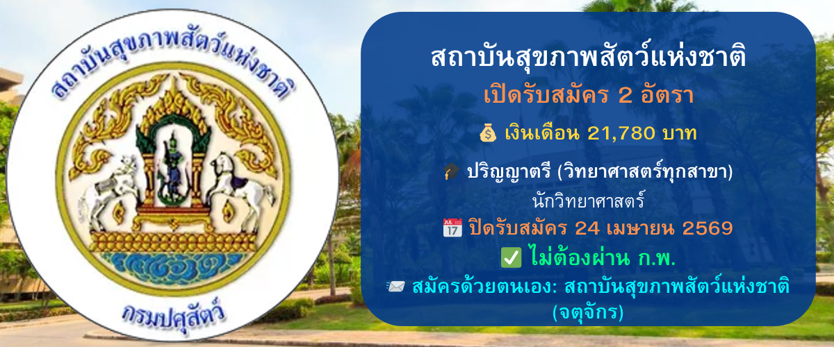 สถาบันสุขภาพสัตว์แห่งชาติ เปิดรับสมัครพนักงานราชการ 2 อัตรา (วุฒิปริญญาตรีวิทยาศาสตร์ทุกสาขา) เงินเดือน 21,780 บาท สมัครด้วยตนเอง 10 – 24 เม.ย. 69 (ไม่ใช้ ก.พ.)