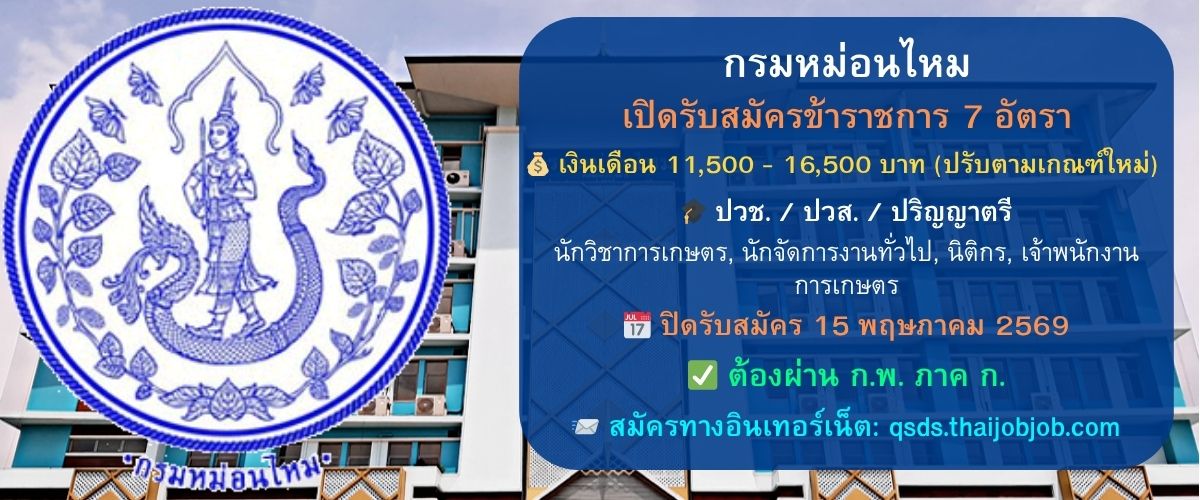 กรมหม่อนไหม เปิดรับสมัครสอบข้าราชการ 7 อัตรา (วุฒิ ปวช. / ปวส. / ปริญญาตรีทุกสาขา) เงินเดือนสูงสุด 16,500 บาท สมัครออนไลน์ 20 เม.ย. – 15 พ.ค. 69 (ต้องมี ภาค ก. ก.พ.)